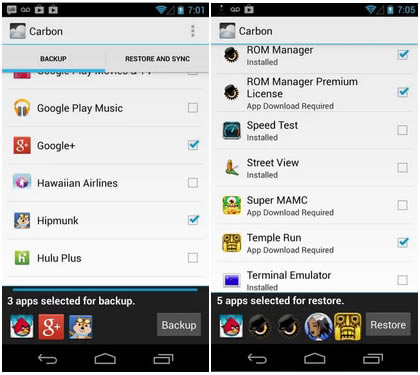 En la pantalla de copia de seguridad, la aplicación android mostrará todas las aplicaciones disponibles en el dispositivo, toca en la parte superior de cada uno para obtener los datos. Cuando toca a cada uno en el campo de selección, existe la posibilidad de marcar el tipo de información que desea registrar. Cuando termine la configuración, sólo tiene que tocar de copia de seguridad para continuar.