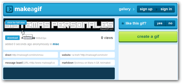 Por ultimo descargamos el Gif animado que hemos creado, si te das cuenta la aplicación ha añadido una odiosa marca de agua en el Gif creado, para quitar eso solo tendremos que registrarnos en el sitio o utilizar una cuenta de Facebook o twitter y con esto eliminaremos la marca de agua.