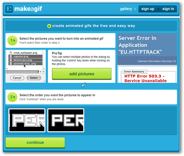 Ingresamos al sitio web de MakeaGIF veremos un botón que dice “add pictures” le damos clic y elegimos las fotografías que queremos adicionar en el Gif animado. Luego de subir las fotos damos clic en “continue”.