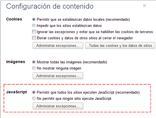 - Permitir que todos los sitios ejecuten JavaScript (recomendado)