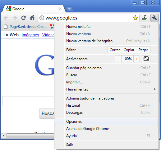 Para bloquear scripts desde Google Chrome sin necesidad de una extensión, lo que haremos será ir a las opciones del menú, para ello hacemos clic en la imagen de herramienta que se encuentra en la parte derecha superior y luego clic en Opciones.