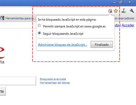 Despues de salir, cerramos o actualizamos con la tecla F5 nuestro google chrome y veremos que en la parte derecha superior nos aparece un icono, hacemos clic en el icono y nos saldra una pequeña ventana, preguntandonos si queremos permiter o bloquear los scripts en esa pagina.