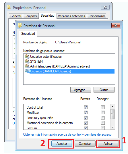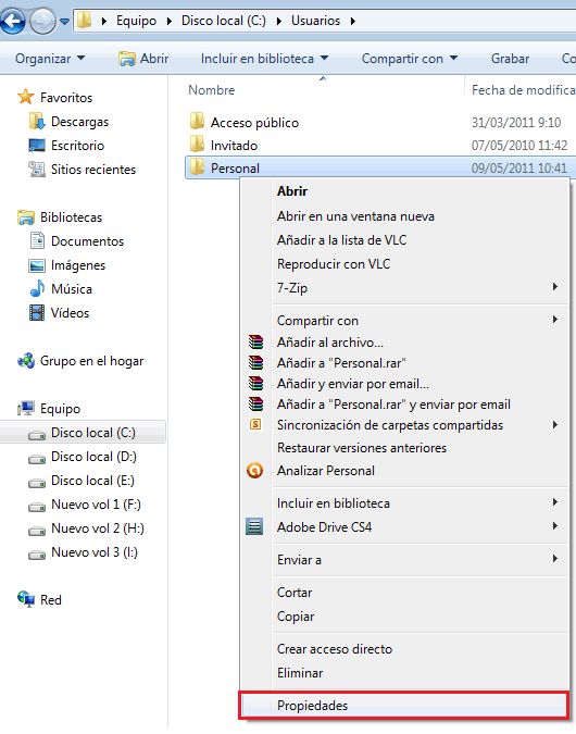 Esta solución es la que me pudo resolver mi problema del Error 8e5e0408 del Messenger. Vamos a Equipo luego al disco C, y abrimos la carpeta Usuarios, aquí hacemos clic derecho en el nombre de Usuario con la cual ingresamos a Windows.
