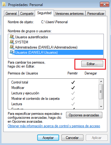 Hacemos clic en la pestaña Seguridad, luego seleccionamos Usuarios, y hacemos clic en Editar.