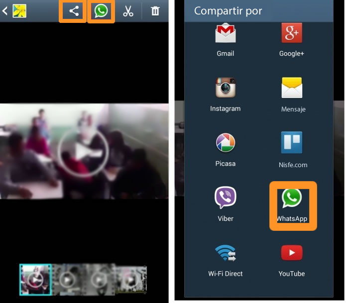 Paso 9. Dentro de la carpeta, deberás tocar el video que desees compartir, y después hacer clic en la imagen con tres puntos que aparece “Compartir” o en el icono de WhatsApp (elegir cualquiera de las dos opciones depende mucho de la versión de Android que tengas en tu móvil). Si has hecho en clic en la primera opción, luego tendrás que abrí el WhatsApp.