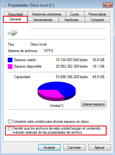 En la pestaña general en la parte inferior desmarcamos para desactivar y marcamos para activar el indexado de archivos en Windows 7.