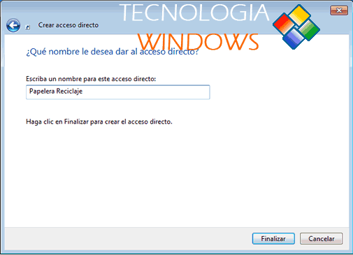 Aquí en esta parte le pondremos el nombre a nuestro acceso directo. Puedes colocarle el que quieras, yo le pondré Papelera de Reciclaje, ahora haces clic en finalizar.