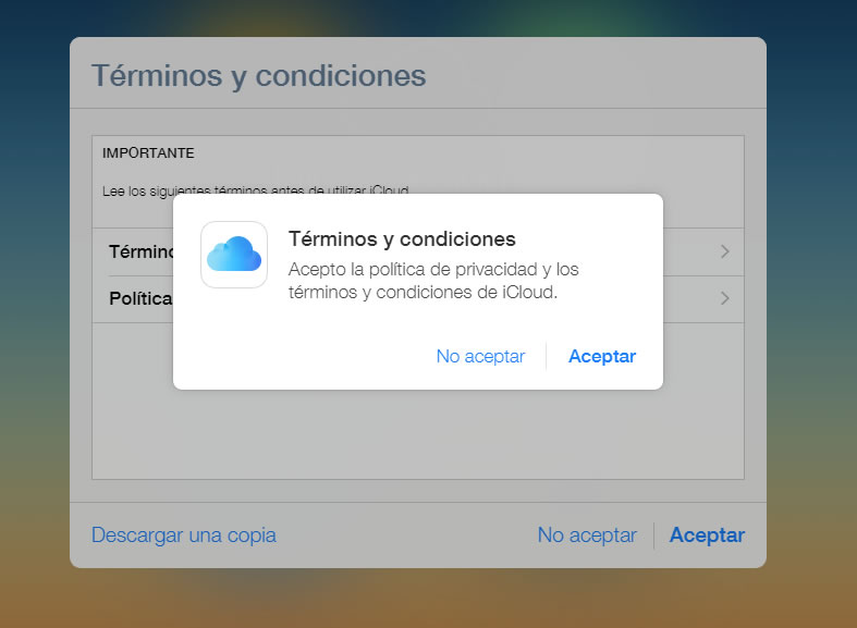 Paso 6. Haz clic en Aceptar para confirmar que estás de acuerdo con los términos y condiciones del uso de iCloud.