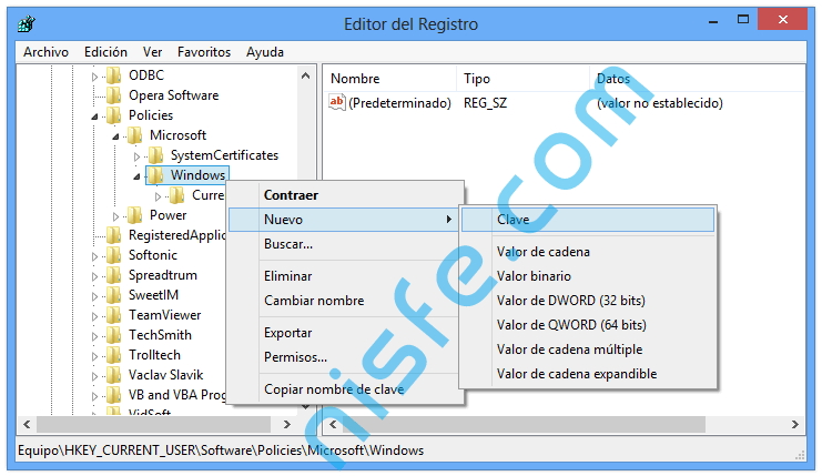 Paso 3. Haz clic derecho sobre la clave “Windows” y escoge “nuevo” y luego en “Clave”.