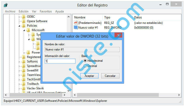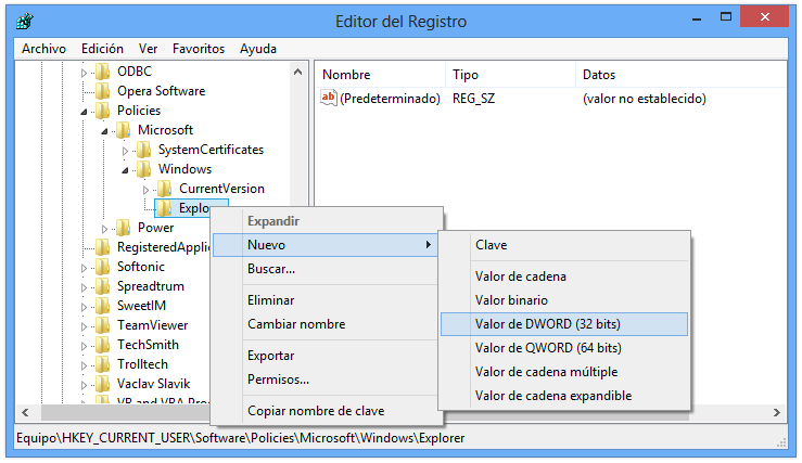 Paso 5.Dentro de la clave creada, agrega un nuevo ítem del tipo “Valor DWORD (32 bits)” con el nombre “NoWindowMinimizingShortcuts”. Para ello solo debes hacer clic sobre “Explorer” y luego en Nuevo.