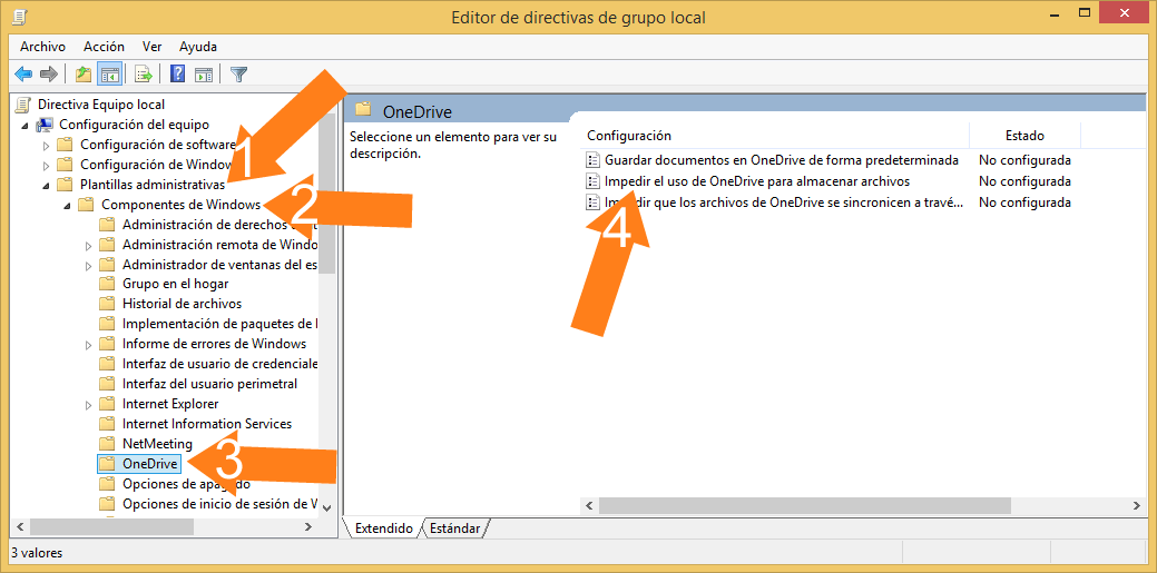 Paso 2. En la parte izquierda, haz clic donde dice “Plantillas administrativas”, luego en “Componentes de Windows” y ahí tienes que buscar la carpeta que diga “Onedrive” y la seleccionas. Y en la parte izquierda haz clic en “Impedir el uso de Onedrive para almacenar archivos”