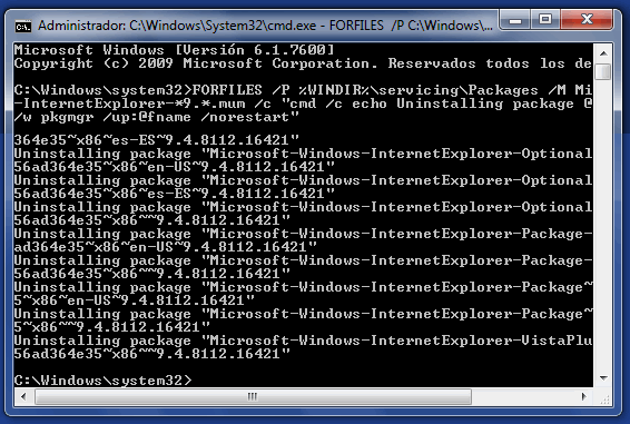 FORFILES /P %WINDIR%\servicing\Packages /M Microsoft-Windows-InternetExplorer-*9.*.mum /c "cmd /c echo Uninstalling package @fname && start /w pkgmgr /up:@fname /norestart"