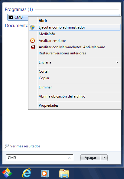 Ejecutamos la consola de comandos como administrador, para ello nos vamos a inicio y en el cuadro escribimos cmd, luego clic derecho y ejecutar como administrador.