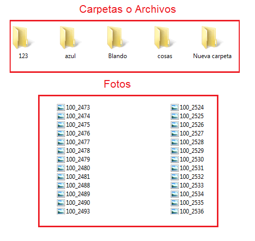 Para renombrar o cambiar el nombre a nuestras fotos o carpetas de forma masiva, lo que haremos es ingresar a la carpeta donde se encuentran nuestras fotografías. En la imagen de arriba he puesto dos ejemplos uno de carpetas y la otra de fotos.