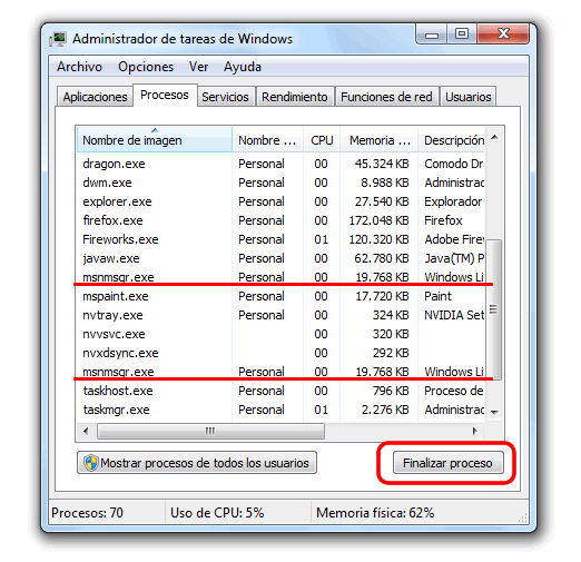 Después de iniciar el administrador de tareas de Windows, ahora tenemos que buscar todos los procesos MSNMSGR.EXE que tengamos abiertos, para cerrar el msnmsgr.exe simplemente lo seleccionamos y luego hacemos clic en Finalizar Proceso, esto lo haces con todos los procesos del mismo nombre.