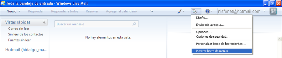 La segunda opcion es cambiar el ID de inicio de sesión, o bien desactivar el inicio de sesión. Ingresa a Windows Live Mail haz clic en el menú herramientas (en el botón de al lado de la de Acciones), luego Opciones, y despues en la pestaña “Conexión”.