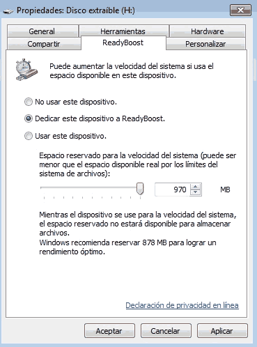 Selecciona la opción dedicar este dispositivo a ReadyBoost, clic en el boton de aceptar y ya tendras tu pendrive, tarjeta SD, etc, como memoria cache. Es recomendable asignarle unos 500 MB para un buen funcionamiento y así darle mucha mayor rapidez si ejecutas Windows 7.