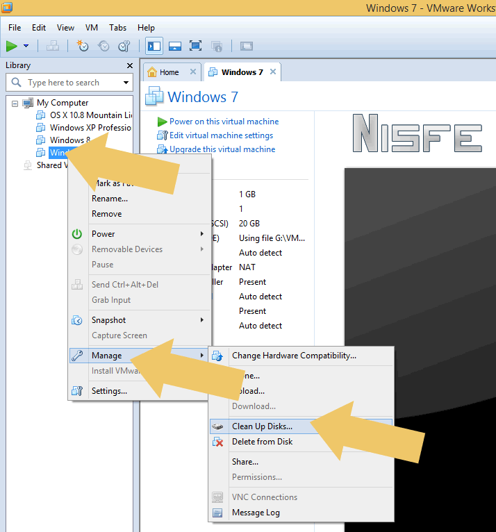 Paso 1. Ejecutamos VMware Workstation, damos clic derecho sobre la maquina virutal, selecciamos “Manage” luego “Clean Up Disks…”