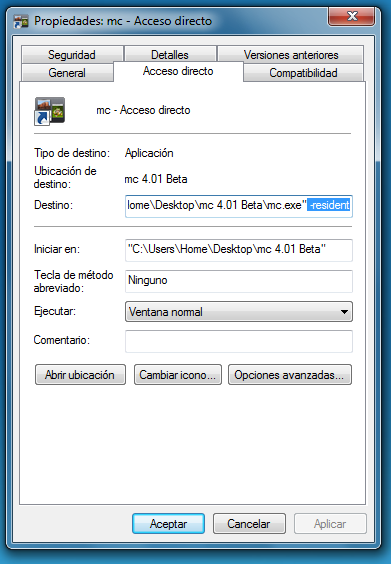 Luego haces clic derecho sobre el acceso directo, seleccionas Propiedades y en la pestaña que dice Acceso directo, ubicas el cuadro de dialogo «Destino» y agregas al final el siguiente texto “-resident” (sin las comillas). Puedes mirar la imagen de abajo para guiarte.
